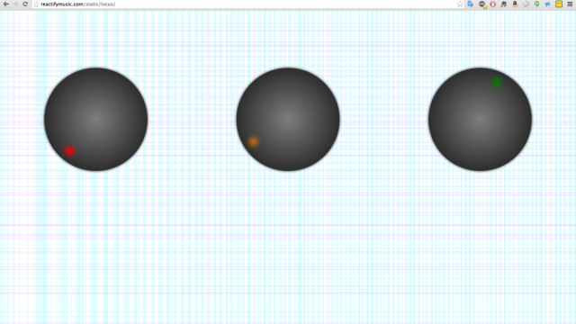 Presented with a minimal interface of three parameters on the screen, the listener can change these parameters to change the characteristics of the music. This current demo contains three ‘tracks’, with ‘Speed’ (the far left circle) being the main differentiator between them. The other two circles control the ‘Intensity’ and ‘Spaciness’. Certain musical elements, such as the lead vocals, will only occur when the parameters are at the correct values. This means that ‘tracks’ can be though of as different configurations of the parameters’ values.